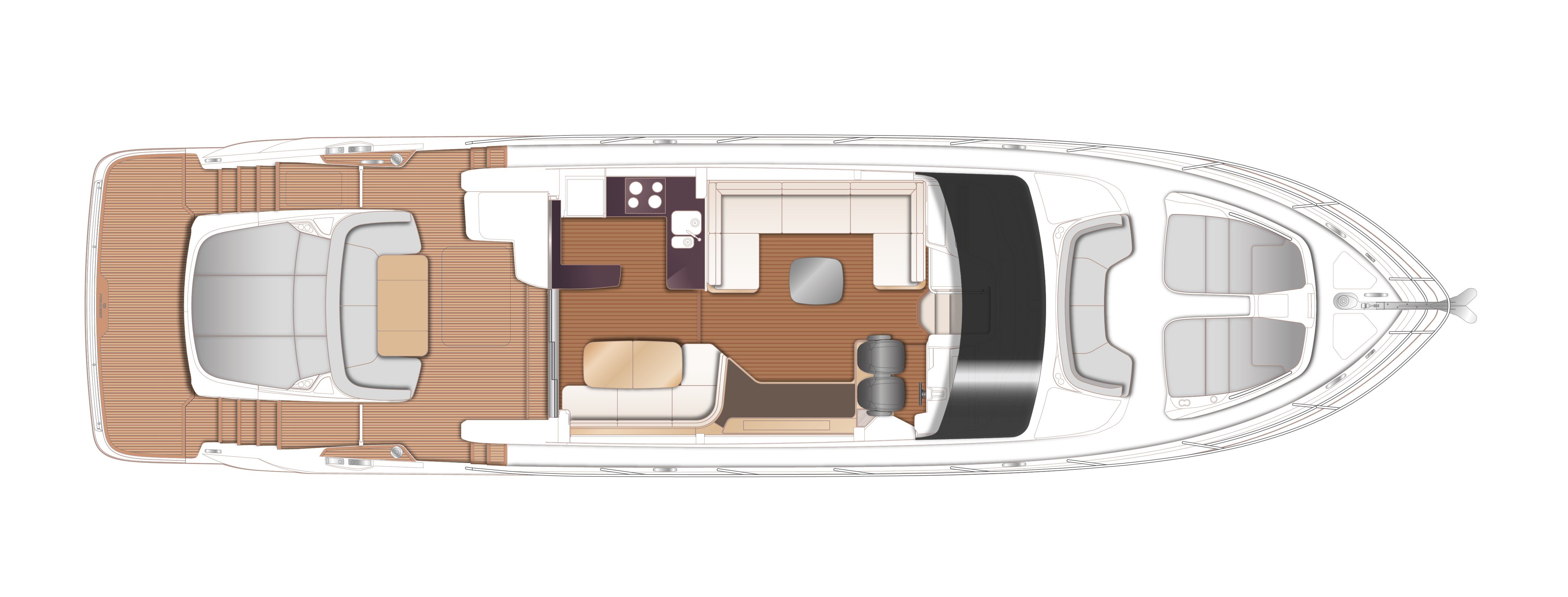 随着航程开启,三片式船尾滑动门和伸缩式天窗主甲板空间引入充足自然光。